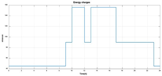 The proposed optimization model was implemented and simulated in a MATLAB environment (R2018b, The MathWorks Inc., Natick, MA, USA). The “intlinprog” solver in MATLAB was used to solve the MILP optimization problem. In this problem, electric charges are the most important factor in determining ESS scheduling. In addition, the demand charges are updated if the average value of electricity usage for 15 min is greater than the initial peak load. Consequently, a simulation was carried out every 15 min. This means that T = 96. In other word, it means that every 15 min of simulation is repeated 96 times. In this case study, the demand charge was 6980 KRW/kW and energy charges incurred are presented in Figure 5. These charges consist of off-peak, on-peak, middle peak, 45.3 KRW/kW from 23:00–09:00, 155.9 KRW/kW from 10:00–12:00 and 13:00–17:00, other times were set at 90 KRW/kW, respectively, and they are based on tariffs provided by the Korea Electric Power Corporation (KEPCO) [10].