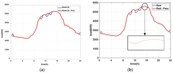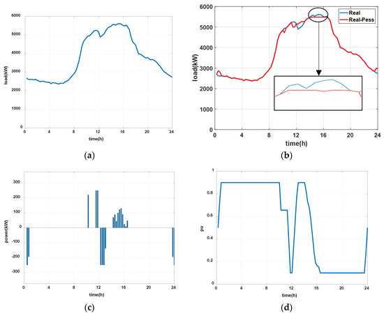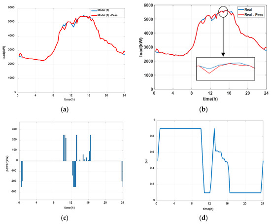 Case 3 was simulated for the predicted load using Model 2. At this moment, the MAPE is expected to be 6.7% and the peak load to be 5302.7 kW. However, contrary to Case 2, only Stage 2 was applied because the predicted peak load was smaller than the initial peak load. Therefore, the ESS was scheduled for arbitrage trading. Figure 9a shows the result of applying the scheduled ESS value to the predicted load while Figure 9b shows the result when the scheduled ESS value was applied to the actual load. Figure 9c,d show ESS power and SOC, respectively.