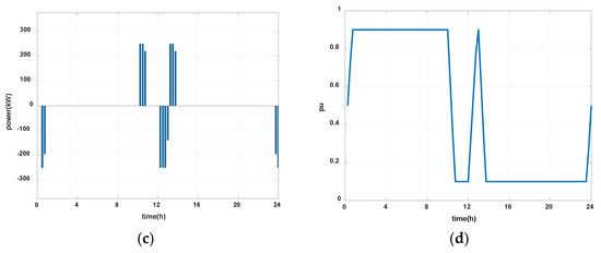 where the time step represents 15 min because electric charges are measured and determined every 15 min in Korea, denotes the initial peak load that determines the current demand charge. and refer to the peak load determined in Equation (6) and the actual load, respectively. , , , and denote the discharge power, discharge state variable, charging power, and charging state variable, respectively. These are decision variables for this problem and are used to calculate through Equation (6). denotes the scheduled ESS power. Equation (6) implies that, after ESS operation, the peak load needs to be updated if it is larger than the initial peak load. in Equation (7) is the active power injected to the network by independent system operator (ISO). The load except the scheduled ESS output is shown in Equation (7). Equation (8) represents the power of the scheduled ESS, whereas Equation (9) limits its range. Furthermore, Equation (10) denotes a constraint that prevents simultaneous charging and discharging. Specifically, and are integer variables that determine the state of ESS for each time. The process in state-of-charge (SOC) can be evaluated as discussed in Equation (11). refer to discharging efficiency and charging efficiency, respectively. Equation (12) denotes a constraint which ensures that ESS operates within the appropriate SOC range and ensures safe operation. As Equation (13) shows, the initial SOC and final SOC were set to have the same value. This implies that the constraint prevents excessive charge and discharge on a specific day.