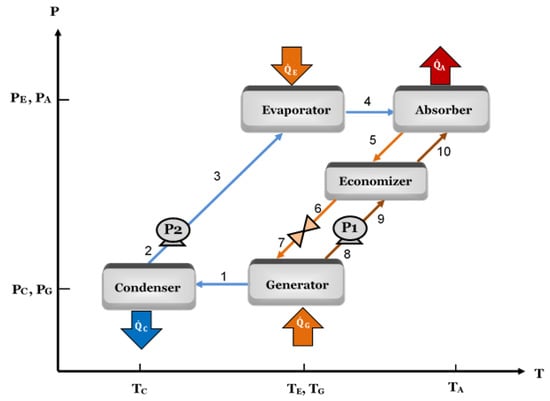 The diagram of the SSHT is shown in Figure 1. The principal components of the system are an evaporator, an absorber, a generator, a condenser, and an economizer. Its operating principle is as follows: the liquid-phase mixture enters to the generator, where a determined amount of heat is supplied at a generation temperature (TG) to evaporate part of the working fluid from the absorbent. The vaporized working fluid leaving the generator (point 1) enters to the condenser where a quantity of heat is delivered at the condenser temperature () from the working fluid condensation, which leaves the component in saturated conditions (point 2). Then, the working fluid is pumped to the evaporator incrementing its pressure (point 3). In the evaporator, an amount of heat is supplied at an evaporator temperature (TE) to produce vapor at saturated conditions (point 4). In the absorber, the vapor is absorbed by the solution with high absorber concentration leaving the generator (point 8) delivering an amount of useful heat at the absorber temperature (TA), being this the highest system temperature. The weak solution leaving the absorber (point 5) flows through the economizer (point 6) preheating the solution going from the pump (point 9) to the absorber (point 10). Finally, the solution leaving the economizer passes through the valve, reducing its pressure (point 7) before entering the generator, starting the cycle again.