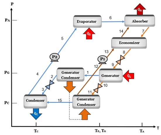 According to Figure 1, the system operates at two pressure levels and three temperature levels. It is considering that the heat is supplied at the same temperature to the evaporator and the generator.