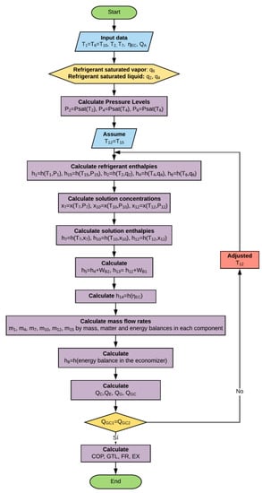 The algorithm followed for the simulation of the DEHT is shown in Figure 3. The input parameters were: The useful power produced in the absorber, the economizer effectiveness, and the temperatures of generation (TG = T1), generation/condensation, (TGC = T2), condensation (TC = T4), and absorption (TA = T9).