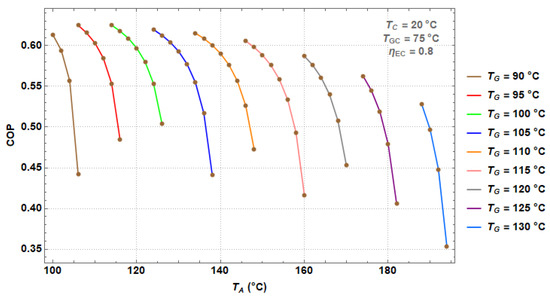 COP as a function of TA at different TG values for the DEHT.