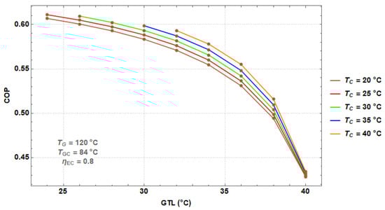 Figure 5 shows the COP as a function of the GTL for different TC values. From this figure, it can be observed that the COP decreases with an increment of the gross temperature lift. This behavior occurs for the same reasons explained in Figure 4, since the GTL is defined as the difference between TA and TG. From the figure, it can be seen that the maximum COP are higher 0.6 for gross temperature lifts of 25 °C, while the lowest coefficients of performance are about 0.4 for gross temperature lifts of 40 °C. Besides, it can be observed that the COP decreases with an increment of the TC values. The increase in TC causes the system to dissipate heat at a higher temperature, which causes a decrease in the COP.