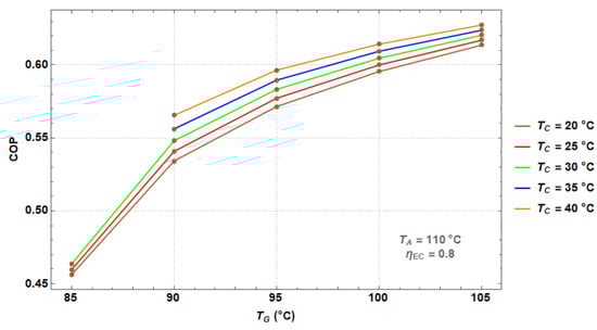 Figure 6 shows the COP as a function of TG for different TC values. It can be observed that the COP increases significantly with an increase of TG, augmenting from 0.46 at a TG value of 85 °C, up to 0.62, at a TG of 105 °C. The increment of the coefficient of performance occurs due to the higher amount of the working fluid produced by the increment of the temperature of the heat supplied to the component.