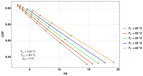COP as a function of FR at different TC values for the DEHT.