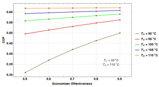 COP as a function of the economizer effectiveness at different TG values for the DEHT.