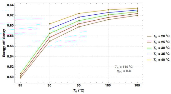 Figure 9 shows the exergy efficiency as a function of the TG for different TC values. It can be seen that the exergy increases significantly with an increase of TG, the minimum exergy value achieved is around 0.5 at a TG of 85 °C, and the maximum values are around 0.62 at a TG of 105 °C. Besides, the exergy efficiency increases when TC increases due to the reasons explained in Figure 6.