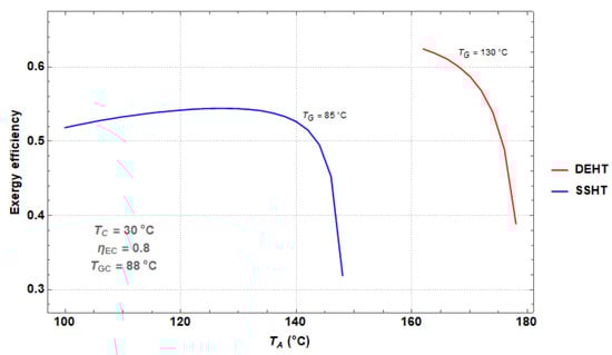 Figure 12 compares the exergy efficiency for both systems as a function of TA. Since the SSHT may operate at temperatures from 85 °C, it can be seen exergy values for TA varying from 100 °C to 146 °C, while for the DEHT the exergy efficiency is reported for TA varying from 161 °C–175 °C. This happens since, for the specified conditions, the generation temperature is considerably higher with the DEHT than with the SSHT. For the DEHT the maximum exergy efficiency was 0.62, while for the SSHT the maximum exergy was 0.54. These values are in concordance with the COP values reported for both systems in Figure 10.