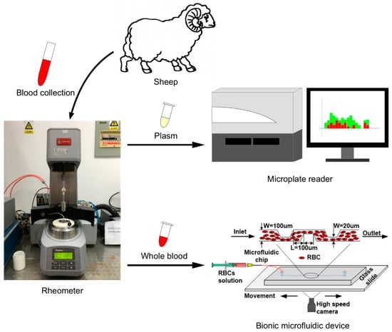 Microfluidic devices, on which the blood flow pattern in simulated small vessels can be observed directly, have recently been used to study erythrocyte movement and blood flow in small vessels in vitro [12]. Based on bionic microfluidic devices, atherosclerotic confinement of vessels and blood flow patterns (including flow rate and physiological and pathological shear stress) in microscale arterioles can be simulated for basic combined research on whole blood and extracellular matrix surface coating or treatment [13,14,15]. However, the flow patterns were controlled by injecting flow rate and pressure, but were too coarse to maintain consistent inner shear stress force and flow rate in a device with several microscale channels. Furthermore, traces of experiment blood were difficult to collect and measure for the evaluation of the blood cell damage. In our previous research, the relations among erythrocyte morphology, membrane damage, and the concentration of specific plasma proteins had been revealed and confirmed, and the changes of plasma free hemoglobin (PFH) and lactic dehydrogenase (LDH) concentrations in plasma can be measured and analyzed to evaluate the degree of erythrocyte rupture and the degree of erythrocyte membrane injury, respectively [16]. Here, we collected fresh whole blood from sheep and exposed it to a fixed shear stress environment generated by a rheometer for blood cell damage assessment. Then, the damaged blood was collected and injected into a bionic microfluidic device, which was designed to mimic arterioles with several continuous stenosis segments, to investigate and evaluate the effects of red cell damage at different degrees on the flow pattern inside the microfluidic channel.