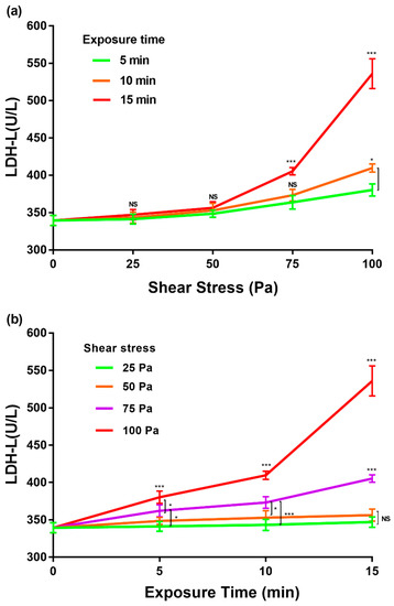 Compared to PFH, LDH is a novel and more sensitive protein label to assess the trauma of the erythrocyte membrane. Differently to PFH release based on erythrocyte rupture, injuries to the red blood cell membrane will induce an increase of LDH concentration in plasma. As the results show in Figure 3a, there was no significant difference in LDH release between the three groups with the exposure times of 5, 10, and 15 min in a low shear stress environment within 50 Pa. The increase of LDH concentration was smooth and maintained a low level. However, when blood was exposed to a high shear stress condition (especially at 100 Pa), the concentration of LDH rose rapidly with the increase of exposure time. Meanwhile, as the curve shows in Figure 3b, LDH release was insensitive to the prolonging of exposure time at low shear stress conditions in 25 Pa and 50 Pa. However, the concentration of plasma LDH increased dramatically in a high shear stress environment, and the longer the exposure was, the greater the influence became. Therefore, high shear stress force was the main factor causing erythrocyte membrane injury, and the long exposure time could aggravate this trauma.
