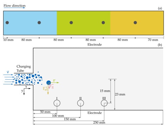 The background of Figure 6 shows the velocity profile in the separation chamber. The profile shows a jet at the charging tube outlet followed by homogeneity. The jet formed at the outlet of the tube affected the particle trajectories considerably. Regardless of their net charge, the particles remained within the jet to ~100 mm from the outlet. Then, they lost speed and were deflected toward the electrode by the Coulomb force. Thus, the simulation visualized the influence of the particle net charge on the particle trajectories within a complex velocity profile. Observing these particle trajectories, we can understand how particles might be charged to ensure their separation in the measuring regions of in situ particle size analyses.