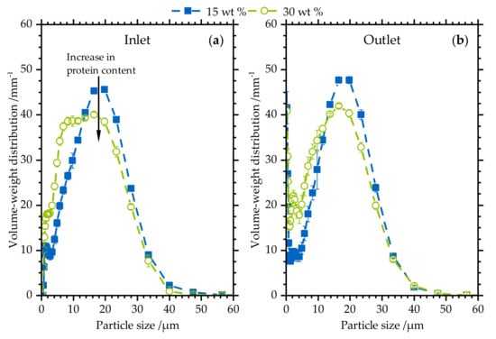 Figure 2 shows the volume–weight density distributions at the Venturi nozzle outlet (panel a) and at the outlet of the charging tube (panel b) in the 15 and 30 wt % powders. In both particle size distributions, the particle size decreased with increasing initial protein content. The particle size distributions were similar at the outlets of the nozzle and the charging tube. The mean particle size (peak position) and the maximum particle size are the same at the tube inlet and the tube outlet. By comparing the distribution of finer particles, an increase in finer particles is visible. Thus, a dispersion along the charging tube is measured. The reason for this dispersion could be the high particle–particle collision number within the charging tube, due to the high turbulence [47]. The results in Figure 2 indicate breaking up particle agglomerates of fine particles during the charging step that could promote electrostatic separation. Contrarily, no electrostatic agglomeration that could impair electrostatic separation is observed.