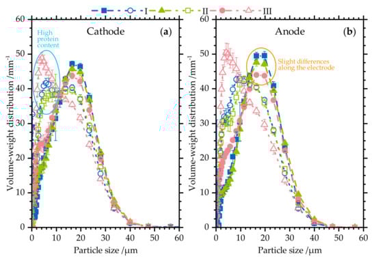 Figure 3 shows the volume–weight density distributions of the powder close to the cathode (a) and the anode (b) in measuring regions I, II, and III (Figure 1b). Increasing the initial protein content refined the particle size distributions at both the cathode and anode, as evidenced by the higher peak at ~6 µm in the 30 wt % compared to the 15 wt % distribution. This higher peak indicates a higher amount of finer protein particles (cf. Figure 2). In the sample with an initial protein content of 15 wt %, the particle size decreased along the investigated regions I, II, and III (note the lower peak height at 16 µm than that at 6 µm). This stepwise decrease in particle size was observed along both the cathode and the anode, as well as in the sample with higher initial protein content (30 wt %). The peak increases from 15 to 30 wt % are more clearly observed at 6 µm compared to 16 µm because increasing the protein content increases the amount of smaller particles. Comparing the particle size distributions at the cathode and the anode, the particles were finer on the cathode regardless of the initial protein content. These results suggest a higher protein content on the cathode (cf. Figure 2). The protein content of the separated powder on the cathode and the anode is approximately 80 and 2.5 wt %, respectively. Thus, protein is enriched on the cathode and starch is enriched on the anode [47,48]. However, the enhancement of finer protein particles near the cathode cannot be correlated with the protein content because the used protein powder is finer than the starch powder. Nevertheless, the particle size distributions at each measuring position in the separation chamber depended on the initial protein content. Thus, the particle size is influenced by the polarity of the electric field, the distance from the charging tube outlet, and (most strongly) the initial protein content. The region in which the particles separate plays a subordinate role on the particle size distribution. Furthermore, the particle size distributions on the anode and cathode resembled the initial distributions determined at the outlets of the Venturi nozzle and the tube.