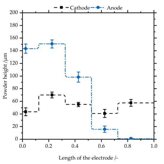 Figure 4 shows the powder height along the cathode and the anode. On the cathode, the distribution of powder was approximately homogeneous along the electrode. The powder height varied most extensively at the second measuring point, and was least variable at the first and fourth measuring points. This significant but extremely low variation should not be overinterpreted; however, the powder height severely decreased along the anode. The powder height was constant at the first two measuring points, and then dropped to zero over the next two measurement points. Thus, the powder heights on the cathode and the anode exhibited very different profiles, suggesting different charges of the particles separated on the two electrodes. In particular, the negatively charged particles exhibited a higher net charge than the positively charged particles.
