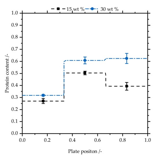 Protein content on the cathode in three different measurement areas for initial protein contents of 15 and 30 wt %. The protein content increases form the first to the second area regardless of initial protein content. In the third area, the protein content decreases (15 wt %) or remains the same (30 wt %).