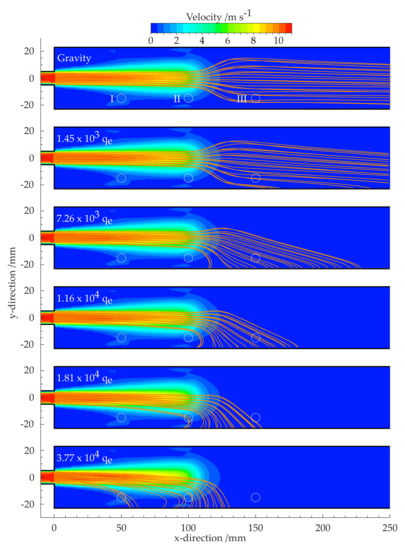 Trajectories of 16 μm diameter spherical particles with different particle charges (multiples of the elementary charge calculated by Equation (1)). The measuring regions I, II, and III of the in situ particle size distribution are indicated by the white open circles. Depending on their net charges, certain particles are not detectable in every measuring region. The background visualizes the velocity profile. The jet formed at the outlet of the charging tube is clearly visible.