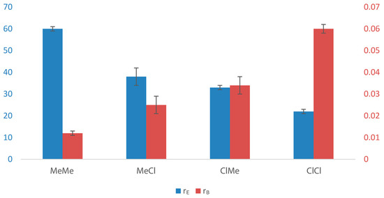 Under the assumption that insertion is the rate-determining step for chain propagation in all cases, ΔΔGDFT indicate no significant difference in comonomer affinity for the two catalysts in terms of rE, and only a small one in terms of rP, as shown in Entries 3–4 of Table 3. The better comonomer incorporation capability of ClCl for rP is, although slightly underestimated, reproduced. Experimental errors of rC are generally higher than those of rE, due to difficulties in accurate determination [26,37,39,88], and we will therefore focus on the discrepancy of experimental and DFT findings for rE in the following.