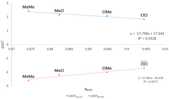 Figure 3. Correlation between ΔΔG corresponding to the r-parameters for ethene/1-butene copolymerization and qZrCl2 for catalysts R1R2 (see also Table S6).