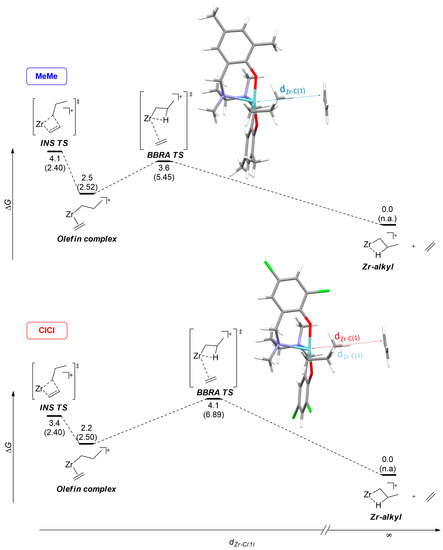 It is instructive to analyze the distances between the Zr center and the C(1) carbon of ethene (dZr-C(1)). Insertion TSs appear to be very similar for the two catalysts, with a dZr-C(1) close to 2.4 Å. This structural similarity is reflected by a similar ΔSINS for the two catalysts; differences in ΔGINS are mainly due to the ΔH INS term, as shown by Entries 1 vs. 3 in Table 4. Conversely, dZr-C(1) is about 1.5 Å longer in the BBRA TS for ClCl than that for MeMe, diagnostic of a looser interaction between the metal and the incoming monomer. A lower ΔH BBRA is found for the former catalyst, as shown by Entries 2 vs. 4 in Table 4, accordingly. Significantly lower ΔSBBRA than ΔSINS are estimated by DFT as a smaller fraction of the 2-›1 particle entropy loss for monomer capture has been paid at the BBRA rather than the insertion TS.