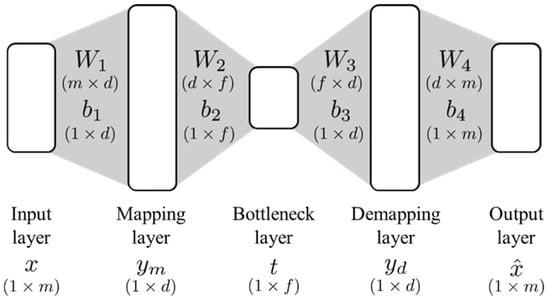 where x, ym, t, yd, and represent the vectors of input, mapping, bottleneck, demapping, and output layers, respectively. W and b are weight matrices and bias vectors, respectively. The dimensions of all the matrices and vectors are summarized in Figure 1. a denotes the nonlinear activation function. The objective of autoassociative neural network training is to find optimal parameter values (i.e., optimal values of W and b) that minimize the difference between the input and the output, i.e.: