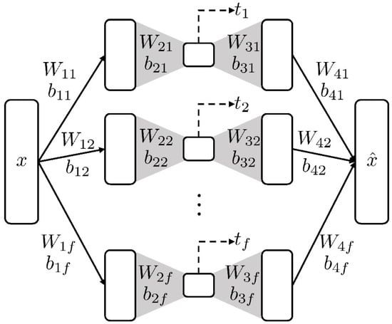 In this network architecture, all the hidden layers are decomposed into f sub-layers to form f decoupled parallel subnetworks. Each subnetwork extracts one principal component directly from the input and reconstructs the pattern that it captures. Then, the outputs from all the subnetworks are added up to reconstruct the input. The mathematical model of this network architecture has the same form as the one in Equation (11) with the structural changes to the weight matrices and bias vectors as below: