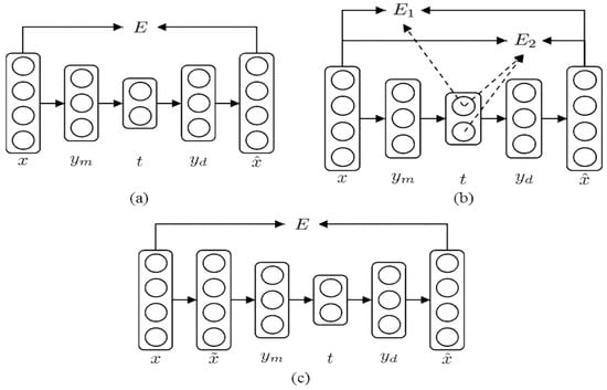 The denoising criterion was proposed by Vincent et al. [40] to extract more robust principal components. To apply the denoising criterion, the corrupted input is generated by adding a noise, such as Gaussian noise and masking noise, to the original input x. Then, the autoassociative neural network is trained such that it can recover the original input from the corrupted input. It was shown that, using the denoising criterion, autoassociative neural networks were able to learn a lower dimensional manifold that captures more essential patterns in the original data. The three objective functions are schematically summarized in Figure 3.