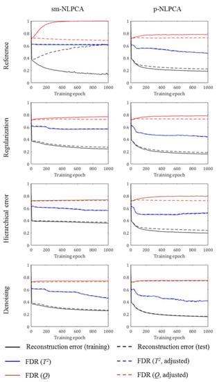 - Despite the decrease in the reconstruction error over a wide range of training epochs, the adjusted FDR value in the residual space increased during only the first few training epochs and was kept almost constant in the rest of the training.