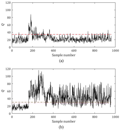 Note that the upper control limits presented in the previous section are obtained by assuming that the data follow a multivariate normal distribution. In the case of linear PCA, if the original data are normal random vectors, the principal components and residuals also have multivariate normal distributions. Thus, the limits in Equations (6)–(10) can be directly applied to the statistical process monitoring using linear PCA. However, in the case of NLPCA, it is not guaranteed that the principal components follow a multivariate normal distribution since they are obtained by nonlinear transformations. Therefore, in this work, we take an alternative approach, where the upper control limits for two statistics are directly calculated from the data without assuming a specific type of probability distribution, given that a large dataset is available. For example, with 100 normal training data samples, the second largest T2 (or Q) value is selected to be the upper control limit to achieve the false alarm rate of 0.01.
