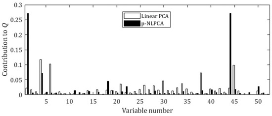 The contribution plots of Q statistic for Fault 1, which involves a step change in the flowrate of the A feed stream, are provided in Figure 6. In the case of the linear PCA, the variables with the highest contribution to the Q statistic were Variables 4 and 6, which are the flowrates of Stream 4 (which contains both A and C) and the reactor feed rate, respectively. Note that although these variables were also highly affected by the fault, they were not the root cause of the fault. On the other hand, in the case of p-NLPCA, the variables with the highest contribution to the Q statistic were Variables 1 and 44, which both represent the flowrate of the A feed stream, the root cause of the fault. Thus, it can be concluded that the process monitoring using p-NLPCA showed some potential to perform better at identifying the root cause of the fault introduced to the system.