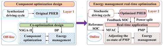 The remainder of the paper is organized as follows. Section 2 introduces the framework of the integrated optimization process as well as a brief explanation for the formulation of the driving cycle. The detailed models of the studied PHEB are shown in Section 3. The co-optimization designs of the driveline component sizing and EMS are provided and discussed in Section 4. A real-time application of a PMP-based EMS employing a novel MFAC controller is proposed and verified in Section 5, followed by conclusions in Section 6.