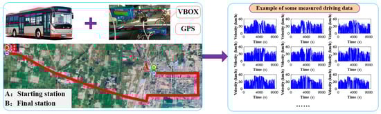 The optimization results of the driveline and EMS are susceptible to driving conditions [42]. Therefore, a representative driving cycle needs to be synthesized to reflect real-road driving conditions for the purpose of optimizing the PHEB. As shown in Figure 2, abundant historical driving data were collected via the onboard measurement method from a real-world bus route. The trip distance from the starting station to the final station was approximately 20.5 km, and each measurement data point was obtained from both a global positioning system (GPS) and Virtualbox (VBOX). More than 285,652 velocity data points were collected for the synthesis of the driving cycle, traveling for approximately 1435 km.
