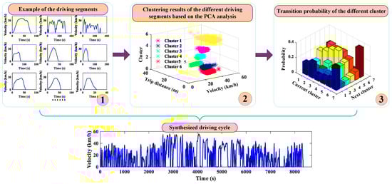 The driving segment is partitioned by a microtrip method from the historical driving data, and a principal component analysis (PCA) together with a k-means clustering method is employed to synthesize a driving cycle [43]. As shown in Figure 3, the main process of the driving cycle synthesis can be summarized as three steps. First, the measured driving data are divided into some driving segments, where the starting and the ending velocities for each segment need to be zero. Second, the statistical properties of each segment are analyzed with the PCA method to decrease the dimensionality of the selected characteristic parameters, and the driving segments that have similar properties are clustered into the same category by the k-means clustering method. Finally, the transition probability between two clusters is calculated according to the clustering results, and the driving segments belonging to the different clusters are randomly chosen to generate a candidate driving cycle through Monte Carlo methodology [44]. Then, the most acceptable driving cycle reflecting the real-road conditions is selected according to the comparison results of the statistical properties between the candidates and measured data. Moreover, the road slope is neglected in the synthesis process of the driving cycle, due to the road slope of the researched bus route being within ±0.01°. The detailed process of synthesizing a typical driving cycle with the PCA and k-means clustering method can be found in Reference [43].