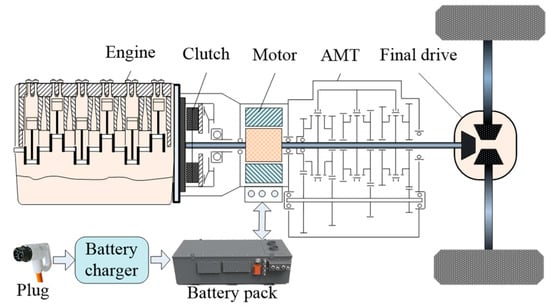 As shown in Figure 4, a PHEB with single-shaft parallel configuration was investigated. The driveline is mainly composed of a diesel engine, electric motor, auto mechanical transmission (AMT), final drive, and power battery pack. The main parameters are given in Table 1.