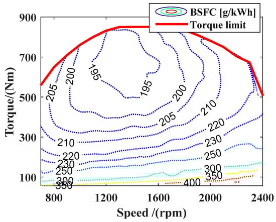 where Lfuel denotes the fuel consumption per unit time, Pe denotes the output power of the engine, Te and ωe respectively denote the torque and the rotational speed of the engine, be (Te, ωe) is the fuel consumption rate (which can be derived through the interpolation method from a brake-specific fuel consumption (BSFC) map (as shown in Figure 5)), ρ is the density of diesel oil, and g is the gravitational acceleration.