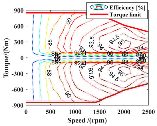 where Pm is the output power of the motor; Tm and ωm denote the motor torque and the motor rotational speed, respectively; and ηm is the efficiency of the motor, which can be interpolated by the motor efficiency map (Figure 6).