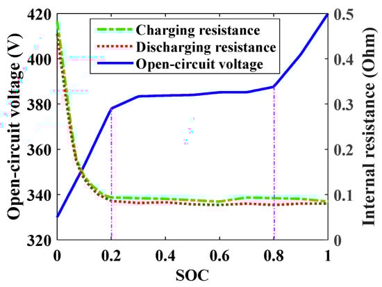As shown in Figure 8, Voc and Rbat are usually described as a function of the SOC, and the relationship between them can be acquired from a battery performance bench test. According to Equation (4), battery system dynamics are expressed as [20,31]