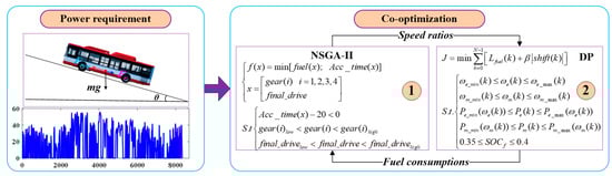 To solve the complicated coupled optimization problem between the driveline components and energy management, a co-optimization framework was established for the PHEB based on a synthesized real-road driving cycle. As shown in Figure 9, the co-optimization framework contains two modules, a driveline parameters optimization module and an energy management optimization module. The former is for finding the preferable speed ratios of the driveline considering the economic and dynamic performance comprehensively, while the latter is for designing a global optimal EMS corresponding to the speed ratios provided by the former. As NSGA-II has the advantage of fast convergence toward the optimal Pareto front while guaranteeing the diversity of a solution [45], it was employed to deal with the multiobjective optimization problems of the driveline, while DP algorithm was used to avoid the impact of the EMS on the optimality.