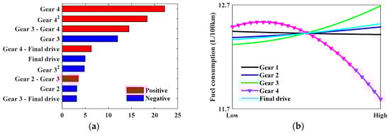 Response (fuel consumption). (a) Effect on fuel consumption (%); (b) Main effect.
