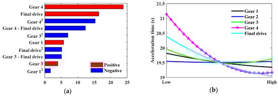 To analyze the impact of the driveline parameters on vehicle performance, a design of experiment (DOE) methodology was employed while using the optimal Latin hypercube (OLH) algorithm to randomly generate 500 samples in a five-dimensional vector space [46], where each row vector can represent a combination of the speed ratios of the AMT and final drive. The responses of fuel consumption and acceleration time with respect to the speed ratios are respectively shown in Figure 10 and Figure 11. It can be seen that gear 4 had the most positive influence on both fuel consumption and acceleration time, while other factors also inordinately impacted vehicle performance. Gear 1 had an insignificant influence on fuel economy, while it had an advantage in improving acceleration performance, and gear 2 was just to the contrary. Moreover, the increase of the speed ratios for the final drive and gear 3 had a negative impact on fuel economy, but was beneficial to the improvement of dynamic performance. The analysis results from our research indicated that all five variables need to be optimized, and the boundaries of the optimization variables need to be well-designed in order to obtain suitable optimal parameters.