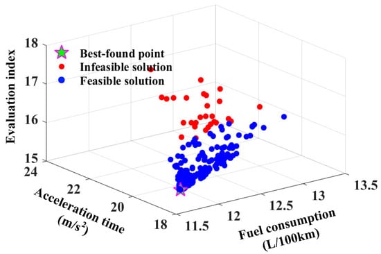 The Pareto front of the co-optimization problem is shown in Figure 12, where there are multiple sets of solutions in a feasible region, and the best-found point can be obtained according to the minimum evaluation index based on the given weight factors between two objectives. Moreover, some solutions in the infeasible region also exist due to the constraint of acceleration time.