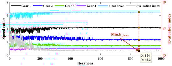 The optimization process is shown in Figure 13, where the maximum iterations endured for 1000 generations. It could be found that the speed ratios and the evaluation index gradually converged with increments of the iteration steps, and both became stable after 600 iteration steps. The optimal speed ratio could be obtained and corresponded to the best-found point with a minimum evaluation index, at the 854th iteration step [46,47].