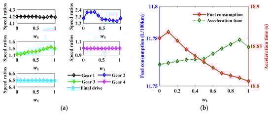 As shown in Figure 14a, the optimal speed ratios change with the weight factor w1 which is varying from 0 to 1, and the variations in the different variables have distinguished characteristics. Gear 1, gear 4, and the final drive have tiny changes in the variation of the weight factor, while gear 2 and gear 3 are fairly distinguishing. Without the consideration of the case that w1 is 0 or 1, the speed ratio of the gear 2 descends with an increase in w1, while gear 3 ascends gradually. In addition, the variation in the optimization objectives corresponding to the changing of the weight factor is shown in Figure 14b. With an increase in the weight factor w1, the fuel consumption decreases from 11.784 L/100 km to 11.755 L/100 km, and the acceleration time increases from 18.827 s to 18.874 s. This indicates that the variation in the weight factor does have an impact on the optimization results. Moreover, there is an incompatibility between the two objectives. To achieve a compromise, the best driveline parameters are determined corresponding to the minimum evaluation index when the weight factor w1 is chosen as 0.5, and the optimization result is shown in Table 4.