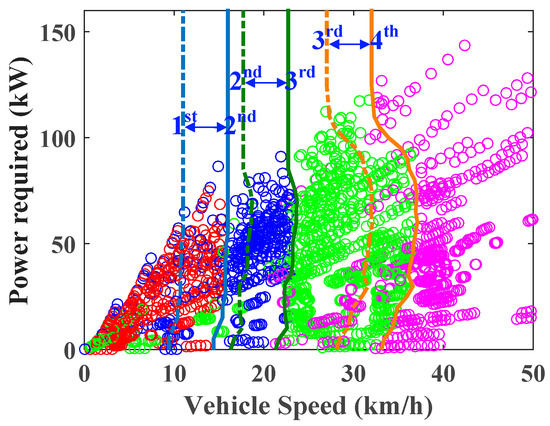 In addition, the economic gear shifting schedule can be designed based on the co-optimization results of the best-found point so as to be utilized as a real-time strategy for the AMT control. As shown in Figure 15, the circles with various colors indicate the optimal AMT gear position, which is required for the economic working points of the engine. Hence, it can roughly pick up the economic gear shifting schedule between the adjacent gears. To avoid frequent gear shifting, a gear shifting delay was also designed, where the solid line and the dotted line represent upshift and downshift, respectively.