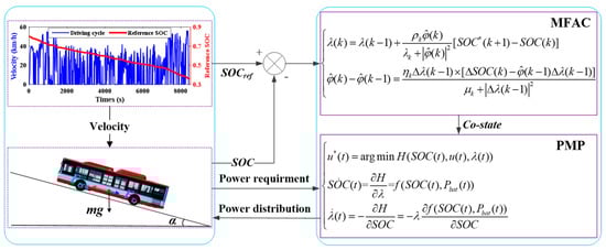 Currently, Pontryagin’s minimum principle (PMP) has been widely adopted for the energy management of PHEBs [25,49]. However, it is still a great challenge to apply the PMP to the EMS in real time for unknown driving cycles. Inspired by previous literature, we transformed this challenge into an SOC trajectory tracking problem in our research [6,25]. Meanwhile, a novel controller based on a model-free adaptive control (MFAC) was employed to adjust the co-state of the PMP online to realize a real-time application. The scheme for our proposed PMP-based real-time energy management is shown in Figure 16.