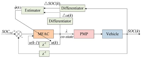 Despite the initial and terminal SOC being completely defined in the optimization problem, the optimal co-state λ(t) can only be calculated by an offline method. To apply the PMP-based EMS in real time without offline calculation, an MFAC controller was designed to adjust the co-state value λ online. As shown in Figure 17, the MFAC controller mainly consists of a control module and an estimating module, where the currently estimated variables with the control variables are calculated and updated in a discrete-time state [50,51].