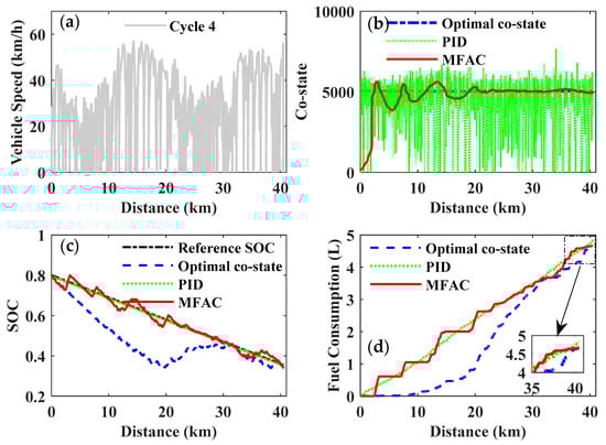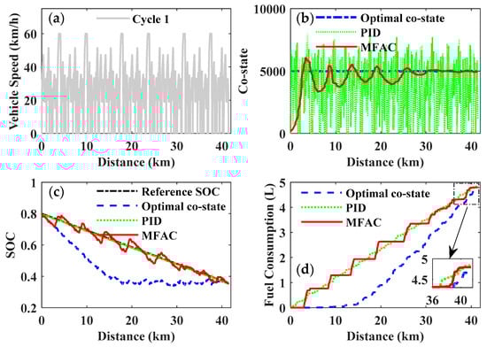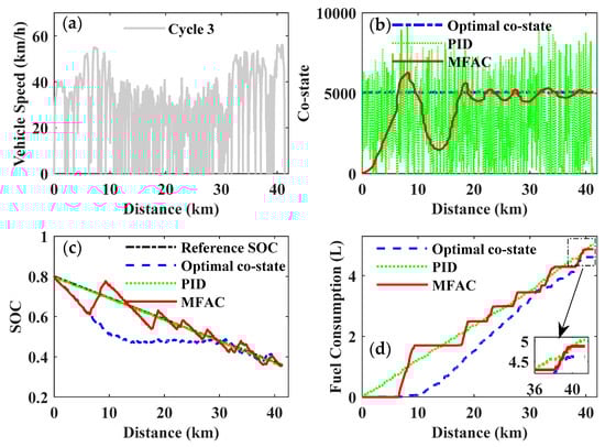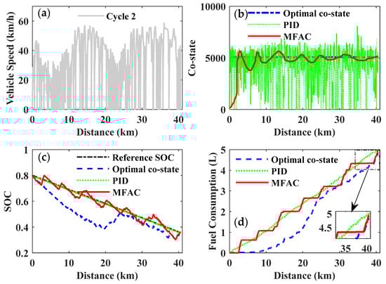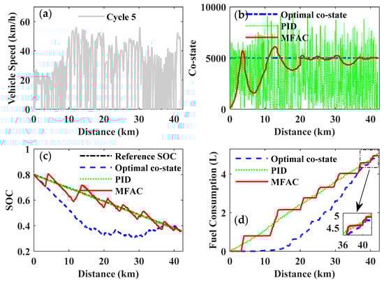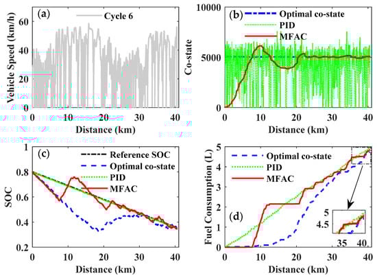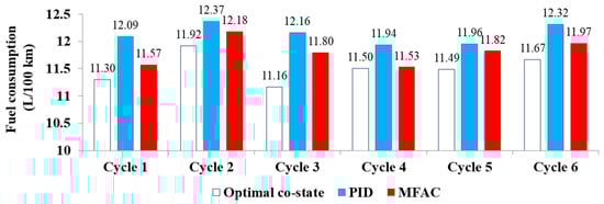 Figure 24 and Table 5 give a comparison of fuel consumption for the selected driving cycles and also the improvement in the MFAC control compared to the optimal co-state control and the PID control. In the course of the simulation for different driving cycles, the fuel economy of the MFAC control was always superior to the PID control, while slightly inferior to the optimal co-state control. However, the optimal co-state of the PMP was strictly dependent on the given driving cycle, which is inapplicable for a real-time application of the EMS with an unknown driving cycle. Although the PID control can be utilized in real-time control of the PMP-based strategy, it cannot achieve the expected objective of improving fuel economy. Therefore, the MFAC will be a preferable and acceptable compromise to realize real-time PMP-based energy management and improve fuel economy.