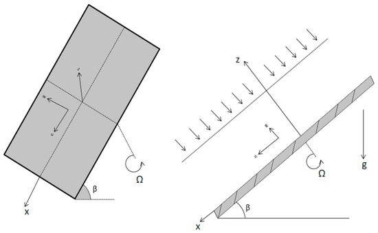 The inclined disk makes an angle β with the horizontal axis. The thickness of the nanofluid film is indicated by h and W stands for the spraying velocity. The thickness of the liquid film is very small as compared to the radius of the disk and therefore the end effect is ignored. The gravitational acceleration is acting as usual in the downward direction. T0 stands for the temperature at the film surface, while stands for the temperature at the disk surface. Similarly, the concentration at the film surface is C0 and on the disk surface is Ch. The ambient pressure p0 is kept constant at the surface of the film and as a result, the pressure becomes only a function of z. The viscous dissipation is ignored, and the basic governing equations of continuity, momentum boundary layer, thermal boundary layer and mass for the unsteady state are given as