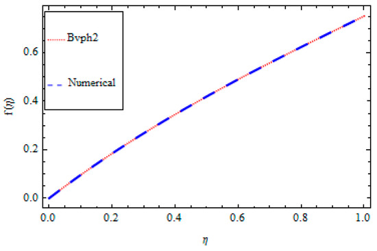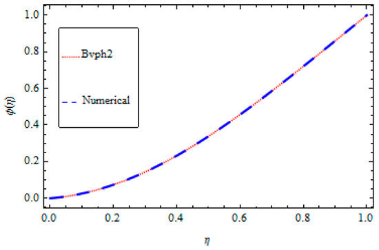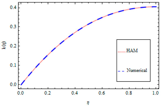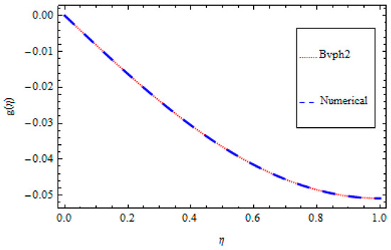 An optimal homotopy analysis method and BVPh2-midpoint method are implemented in the present analysis for the solution of the non-linear ordinary differential Equations (9)–(14) subject to the boundary conditions given in Equation (15). The set techniques are utilized to get the solutions for highly non-linear equations. The optimal HAM [27,28,29,30,31] gives better results compared with perturbation techniques and other conventional investigative techniques. Firstly, the optimal HAM gives us a remarkable flexibility to pick the equation type of linear sub-problems. Secondly, the optimal HAM works regardless of the possibility that any small or large physical parameters in determining equations and the boundary/initial conditions do not exist. Particularly, unlike perturbation and other analytic techniques, the optimal HAM gives us an advantageous approach to guarantee the convergence of a series solution by presenting the supposed convergence control parameter into the series solution. The comparison of the HAM and numerical solution is given in Table 1, Table 2, Table 3, Table 4, Table 5 and Table 6 and Figure 2, Figure 3, Figure 4, Figure 5, Figure 6 and Figure 7, while the graphical representation for the 10th-order approximation displays the error decay in Figure 8.