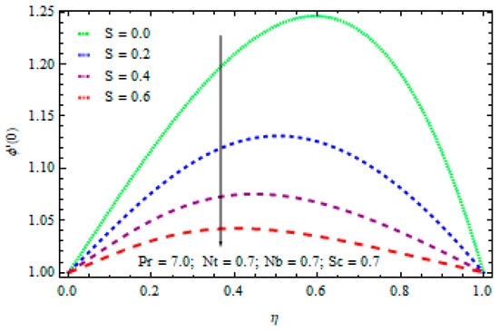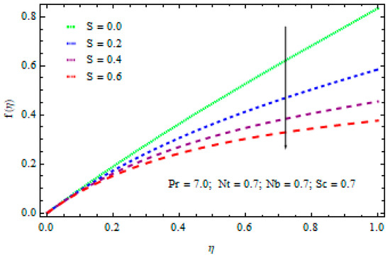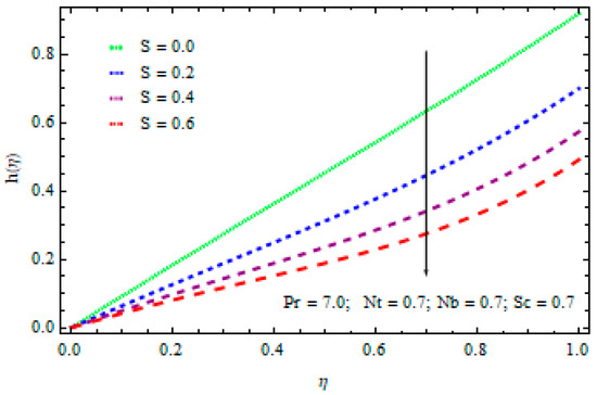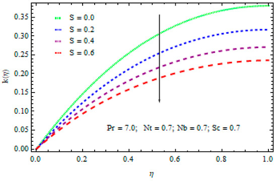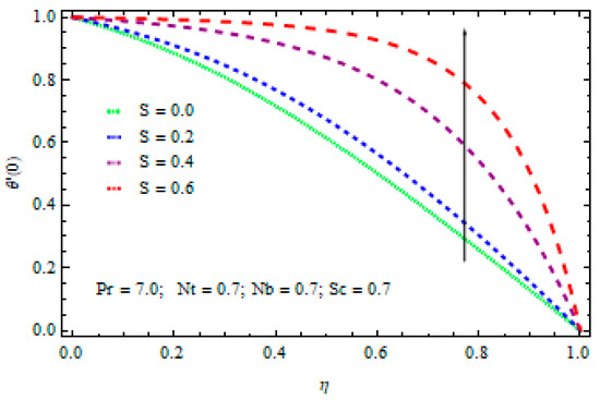 - The temperature values drop with the rise in factor S. The heat flow from sheet to fluid reduces with the rise in S and results in a cooling effect.